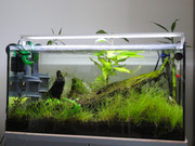 Има голям избор от към растения по форумните пазари, но моят избор е силно ограничен. Аквата ми се получава доста нисък за по-високи, а тези които се водят за среден план или не ми допадат или ми идват трудни. Сложих малко микрозориум в дупките на корените, ей така за цвят. Имал съм болботис, ам той расте със скорост на мангровият корен. Мъхове също прескачам, наситих се на тях. Искаше ми се малко бликса да сложа, но много избързах със скейпирането и не можах да реагирам. Иначе има една празнина между корените, там може и да добавя. Нещо червенко за цвят можех да вкарам, но това ми е над възможностите.